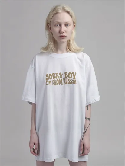 Традиционный прямой крой. Рефлективный (светоотражающий) принт пленка золотого цвета на груди "SORRY BOY I'M FROM RUSSIA".