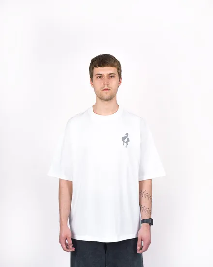 Футболка из хлопковой ткани повышенной плотности приятного молочного цвета. На спине объёмный пафф-принт темно-серого цвета в форме звезды с подтеками, собранной из абстрактных авторских букв, формирующих название бренда. Спереди - лаконичная буква «U», выполненная в том же визуальном стиле. В меру свободный крой с акцентом на силуэт и посадку отсылает к эстетике современной уличной культуры. Модель сочетает выразительный графический элемент с продуманной простотой базовой вещи. Износостойкий принт.