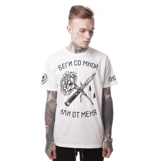 Футболка «Беги со мной или от меня» выполнена из 100% хлопковой ткани. Традиционный силуэт. Прямой крой. Втачной рукав и круглый эластичный ворот. Представлена в однотонной расцветке. Украшена символическим изображением на груди и лаконичным брендингом на рукавах, выполненными посредством печати. Доступна в двух цветах: черный и белый.