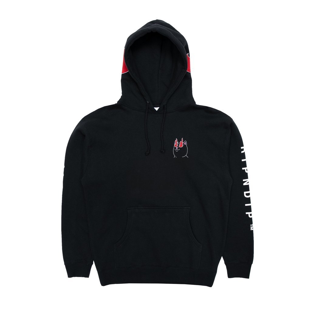 Худи от американского бренда RIPNDIP. Толстовка изготовлена из плотного тяжелого хлопка. Имеет анатомический крой, регулируемый капюшон на затяжках и карман-кенгуру. Подол и манжеты оснащены специальной эластичной резинкой для более комфортной посадки. Модель представлена в классической черной расцветке, дополнена ярким принтом на груди, спине, капюшоне и рукаве.