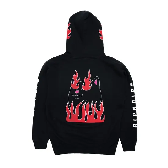 Худи от американского бренда RIPNDIP. Толстовка изготовлена из плотного тяжелого хлопка. Имеет анатомический крой, регулируемый капюшон на затяжках и карман-кенгуру. Подол и манжеты оснащены специальной эластичной резинкой для более комфортной посадки. Модель представлена в классической черной расцветке, дополнена ярким принтом на груди, спине, капюшоне и рукаве.