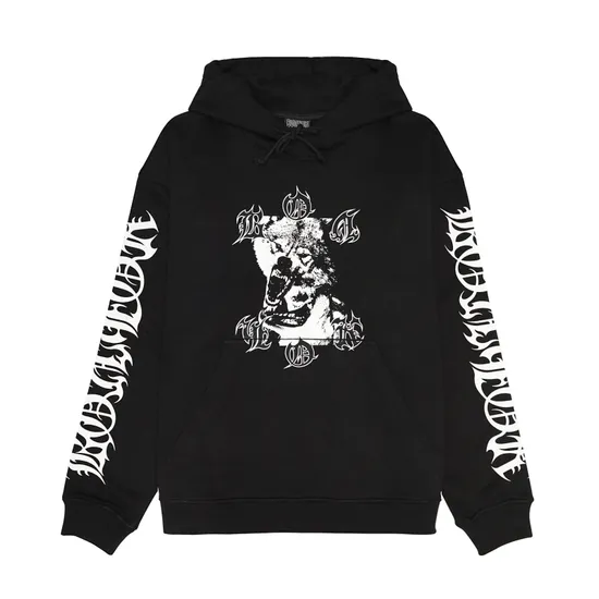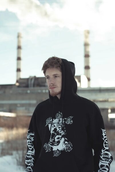 Худи с начесом. Капюшон, затягивающийся на шнурок, заниженные плечи, свободный крой, подол и манжеты в рубчик, рефлективный принт шелкография, жаккардовая нашивка с лого на манжете.