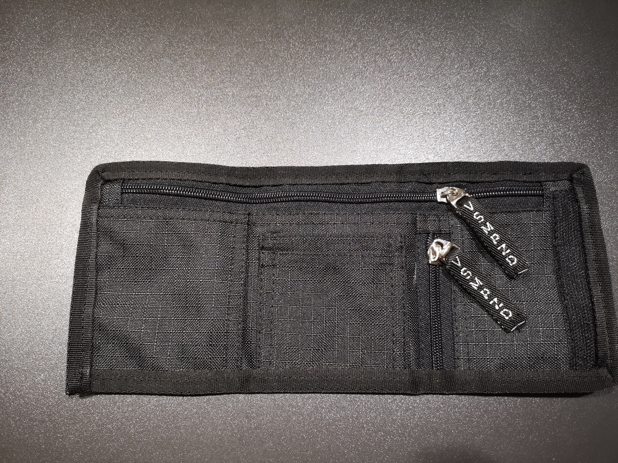 Кошелёк выполнен из плотного полиэстра. Основное отделение для купюр под молнией. А так же есть ещё одно небольшое отделение под молнией и 3 небольших отделения без молнии. Кошелёк складывается на липучку.