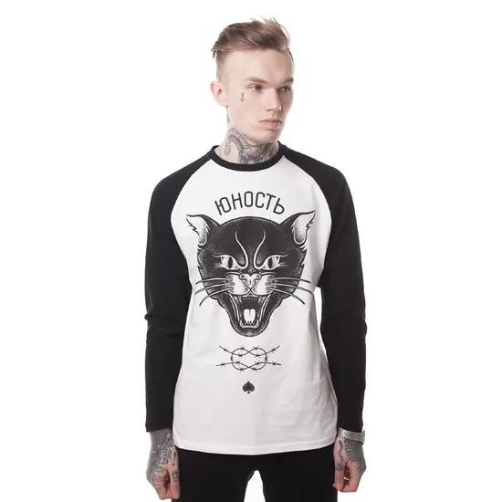 Лонгслив ЮНОСТЬ выполнен из хлопковой ткани. Традиционный силуэт, прямой крой, рукава реглан и круглый ворот. Лонгслив представлен в чёрно-белой расцветке, с нанесением принта на груди и на спине.