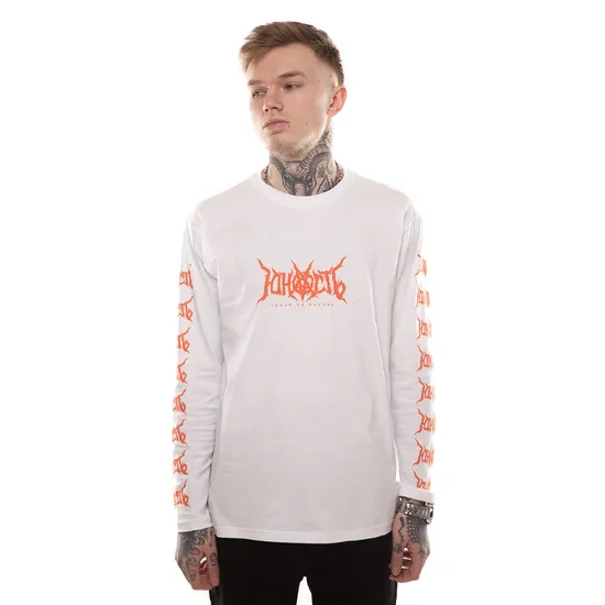 Лонгслив «Танцы на костях» выполнен из ткани длинновоколонного хлопка высокой плотности. Традиционный силуэт. Прямой крой. Втачной рукав. Круглый ворот. Представлен в однотонной расцветке. Украшен принтами в стилистике новой коллекции на груди и вдоль рукавов. Доступен в двух цветах: черный и белый.