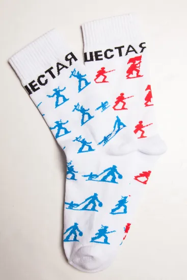 Носки российского бренда 1/6, выполненные из махровой ткани на основе хлопка и эластана. Традиционная форма, средняя длина, эластичные манжеты, укрепленная носовая часть и пятка. Носки представлены в однотонной расцветке, которую украшает оригинальный рисунок.