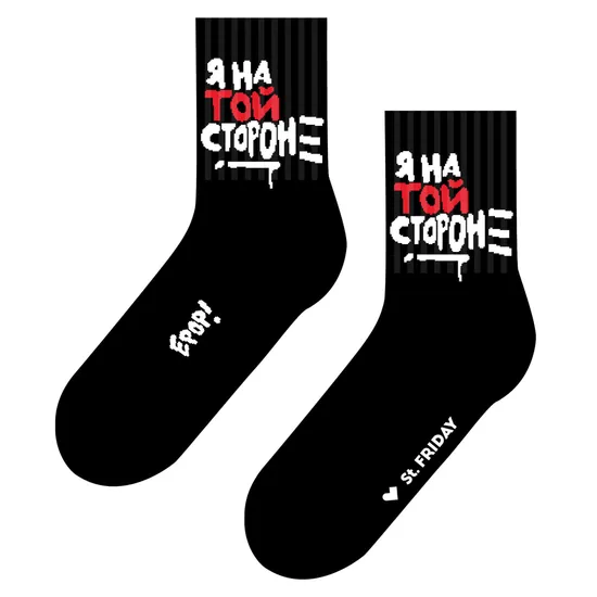 Каждый сам выбирает, на чьей он стороне. Мы выбрали. Мы на той стороне, где командой Той. И на другую сторону мы не перейдем, даже не просите. Эта модель носков - укороченная, средней высоты - 10-15 сантиметров (смотря, как измерять, конечно). Команда Той - это дуэт художников из Нижнего Новгорода. Их название - Той, обозначающее неумелого райтера, - отражает их стиль: намеренно “детский” и непрофессиональный. Ребята часто обыгрывают название своей команды в работах.
