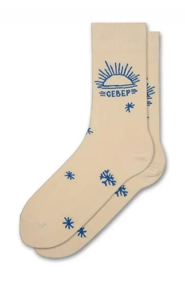 Модель для тех, кто обожает партаки, но тату-мастера боится. Автор задумал для вас носки телесного цвета, а мы сделали татуировки синими, как настоящие, чтобы вы могли красоваться перед друзьями «забитыми» щиколотками. Модель «Север» – призёр St.Friday Contest 2018. Автор: Анна Кипоть.