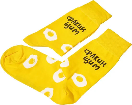 Вас все достало? Помогут носки-амулеты! Просто надевайте их, и самое сильное оружие защиты у вас в руках. Точнее – на ногах! А руки теперь свободны! Два магических волшебных слова защищают от неурядиц, заморочек и сглазов. Они как мягкий хлопковый щит, непробиваемый проблемами (только любовью и нежностью)! Они как клюв римского гуся, они как разбитое золотое яичко. А «Факин» или «Сракин» – пусть вопрос останется открытым. Модель «Ср(ф)ракин щит» – призёр конкурса St.Friday Contest 2018. И так её описала автор, дизайнер Люба Ночникова – у нас лучше и не выйдет!