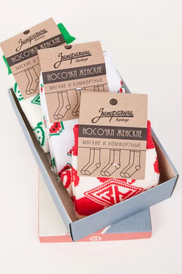 Комплект женских носков российского бренда Запорожец. Натуральный хлопок, традиционная форма с укрепленным носком и эластичная резинка в верхней части. Носки представлены в трех расцветках, украшенных изображениями овощей.
