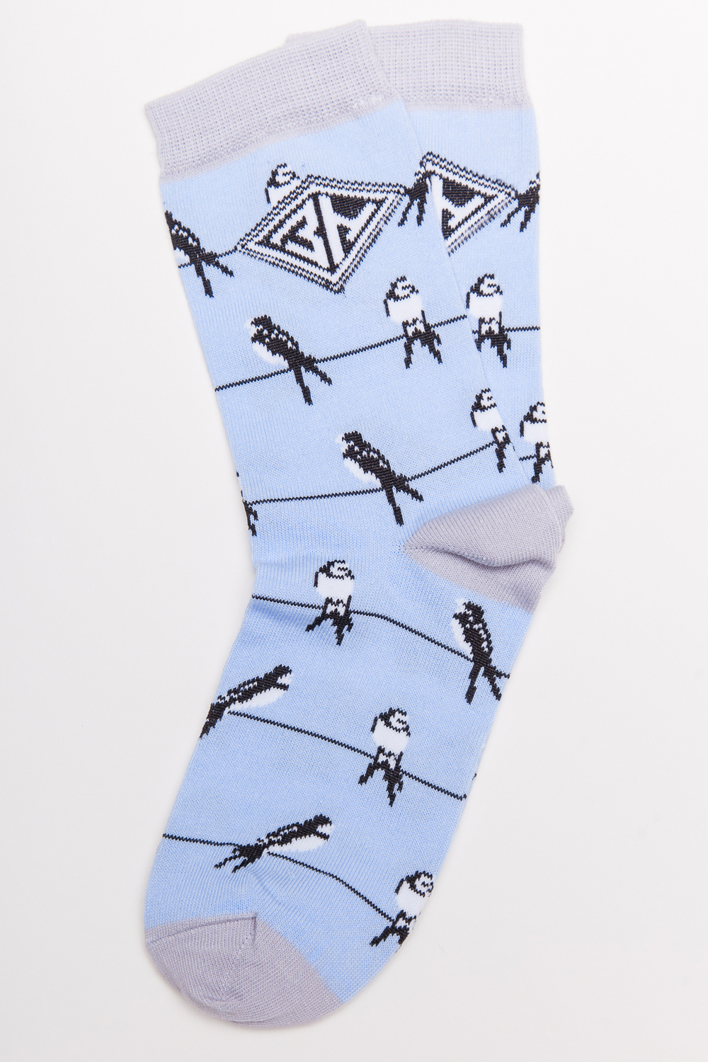 Женские носки от российской марки "Запорожец", выполненные из приятной, хлопковой ткани. Традиционная форма, средняя длина, эластичная резинка в верхней части, укрепленная пятка и носок. Носки представлены в оригинальной расцветке с изображением ласточек на проводах и логотипом марки.