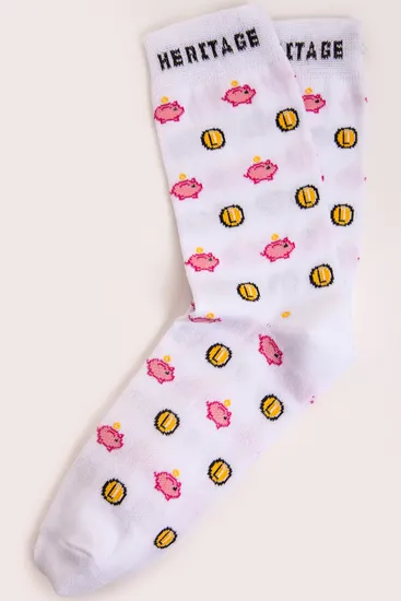 Носки от российского бренда Запорожец, выполненные из ткани на основе хлопка. Традиционная форма, средняя длина, укрепленный носок с пяткой и эластичная резинка в верхней части, обеспечивающая оптимальную фиксацию. Носки представлены в оригинальной расцветке, украшенной изображениями свинок.