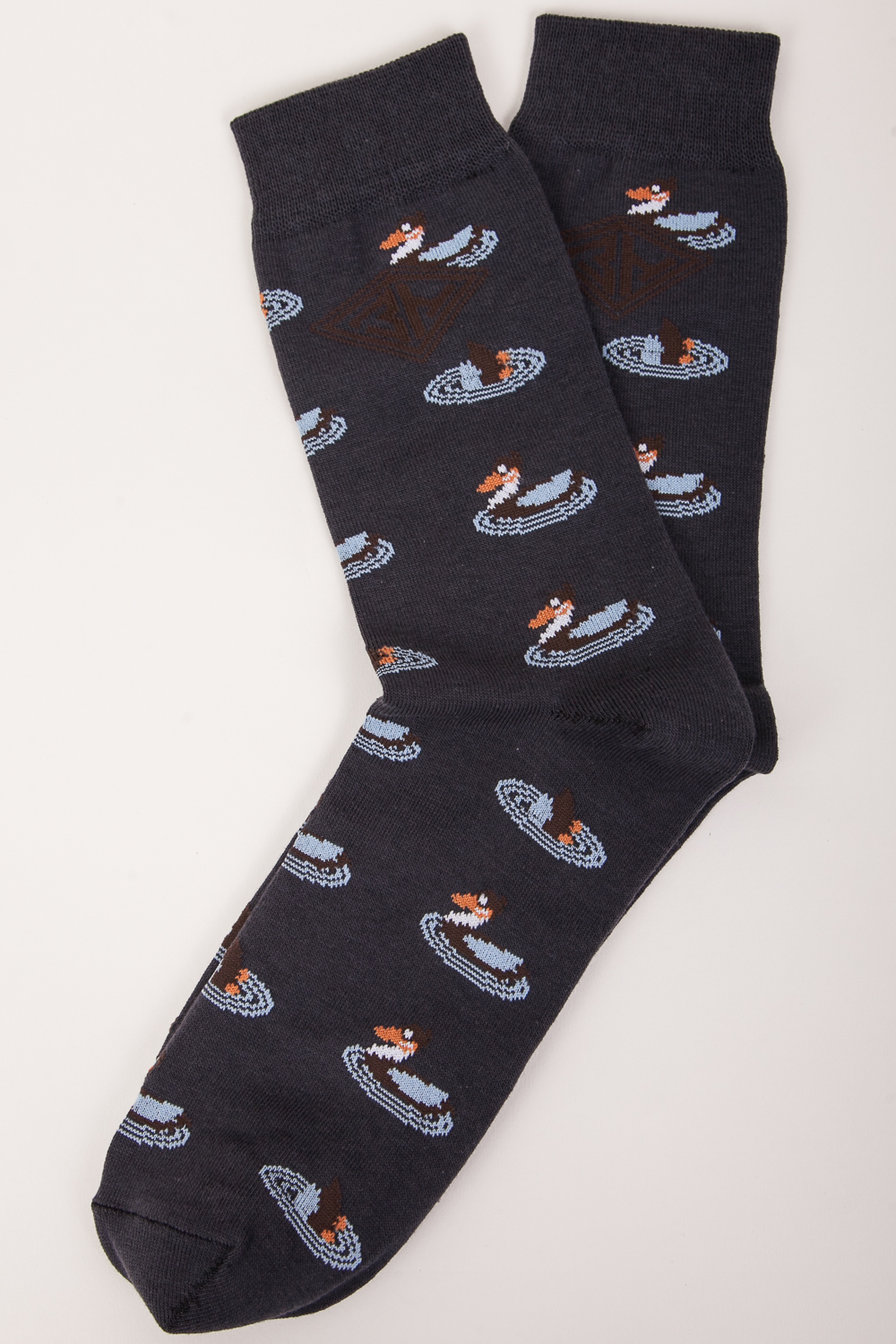 Женские носки Запорожец, выполненные из натуральной хлопковой ткани. Традиционная форма, средняя длина, укрепленный носок с пяткой и эластичная резинка в верхней части, обеспечивающая оптимальную фиксацию. Носки представлены в оригинальной расцветке, украшенной изображениями уток на всей поверхности.