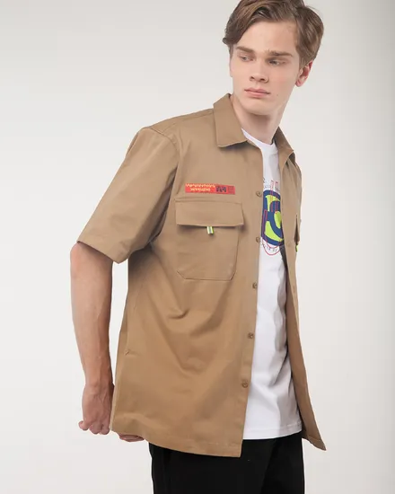Мужская рубашка ЮНОСТЬ выполнена из хлопковой ткани. Урбанистический силуэт, свободный крой и застёжка на пуговицах. Короткие рукава, два нагрудных кармана и прямой укороченный подол. Рубашка декорирована рефлективным принтом.