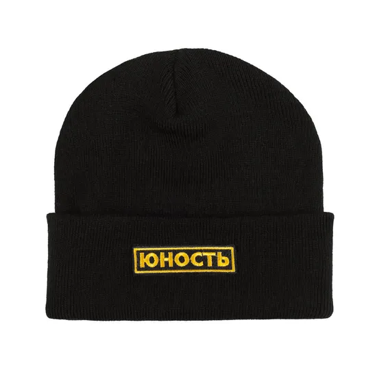 Шапка уличного бренда ЮНОСТЬ, выполненная из приятной акриловой ткани. Традиционный силуэт с отворотом. Шапка представлена в однотонной расцветке, украшенной нашивкой с фирменным брендингом.