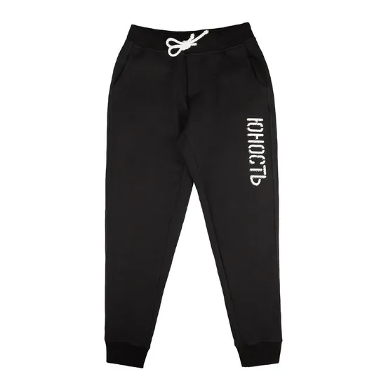 Спортивные брюки ЮНОСТЬ, выполненные из натуральной хлопковой ткани. Традиционный, зауженный книзу силуэт с эластичными манжетами у основания штанин. В поясе резинка и шнур для лучшей регулировки размера. Спереди два кармана для рук и один карман сзади. Брюки представлены в однотонной расцветке, украшены фирменным логотипом на одной брючине.