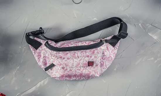 Поясная сумка от бренда HOOK, выполненная из прочной нейлоновой ткани, традиционная форма, одно основное отделение и два дополнительных кармана на молнии и регулируемая застёжка на пояс, украшена оригинальным принтом